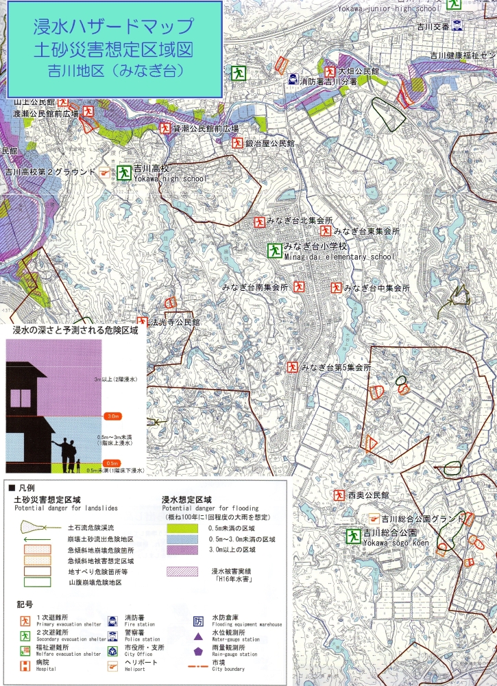 この防災情報マップは、平成25年発行「浸水ハザードマップ土砂災害想定区域図 吉川地区(中吉川)」を元に、平成26年に危機管理課の承諾を得て抜粋加工及び掲載を行っています。